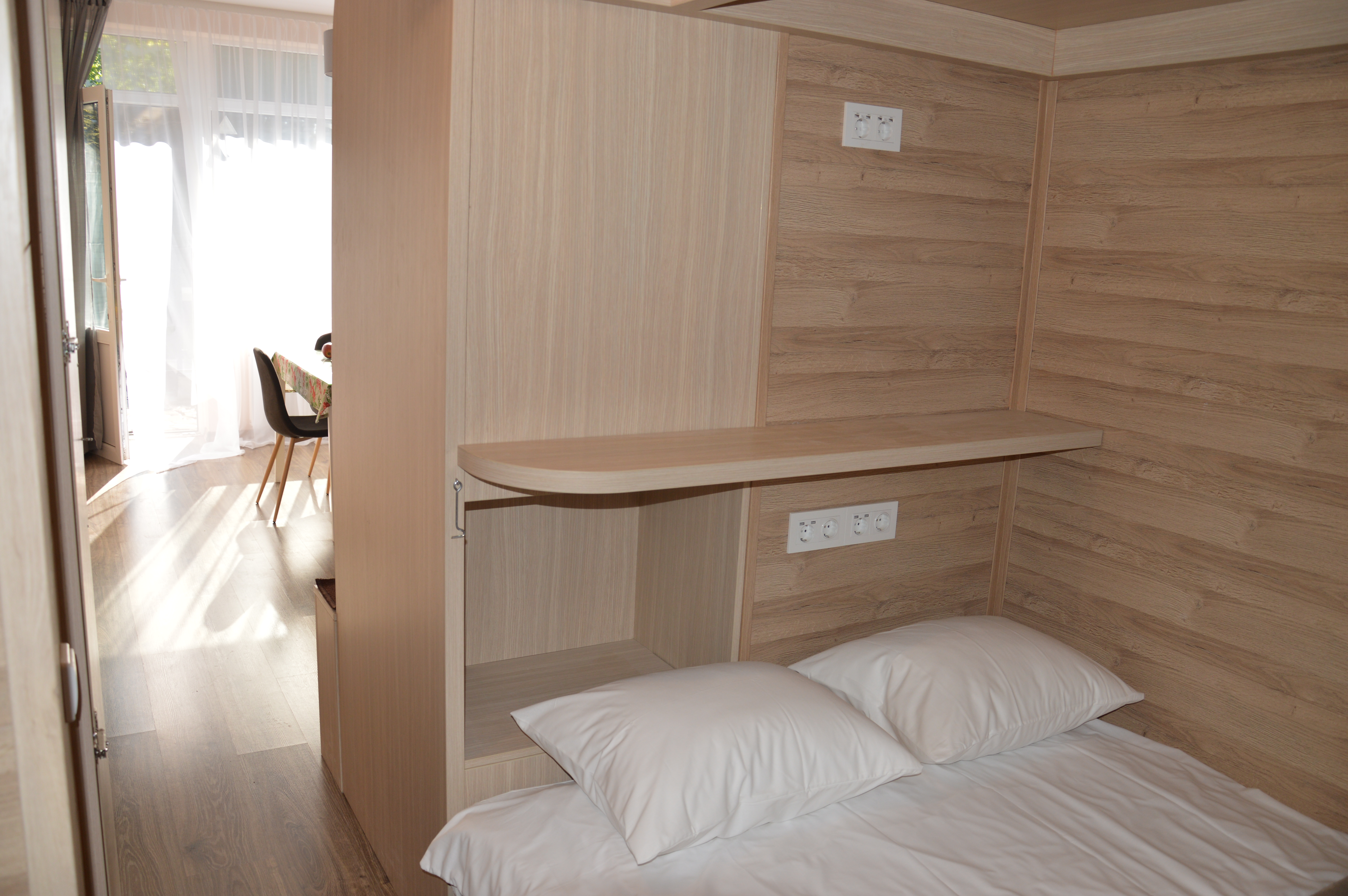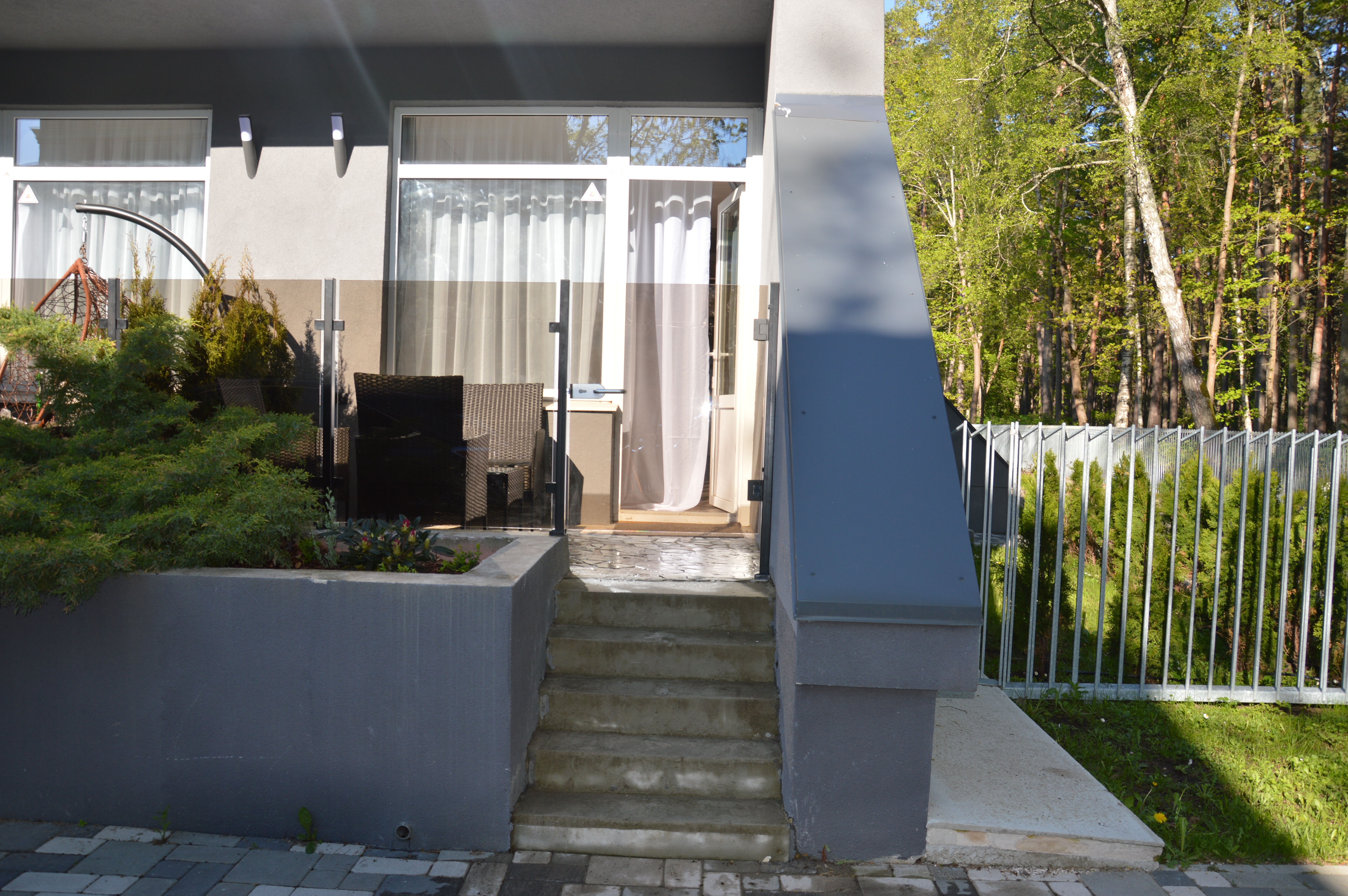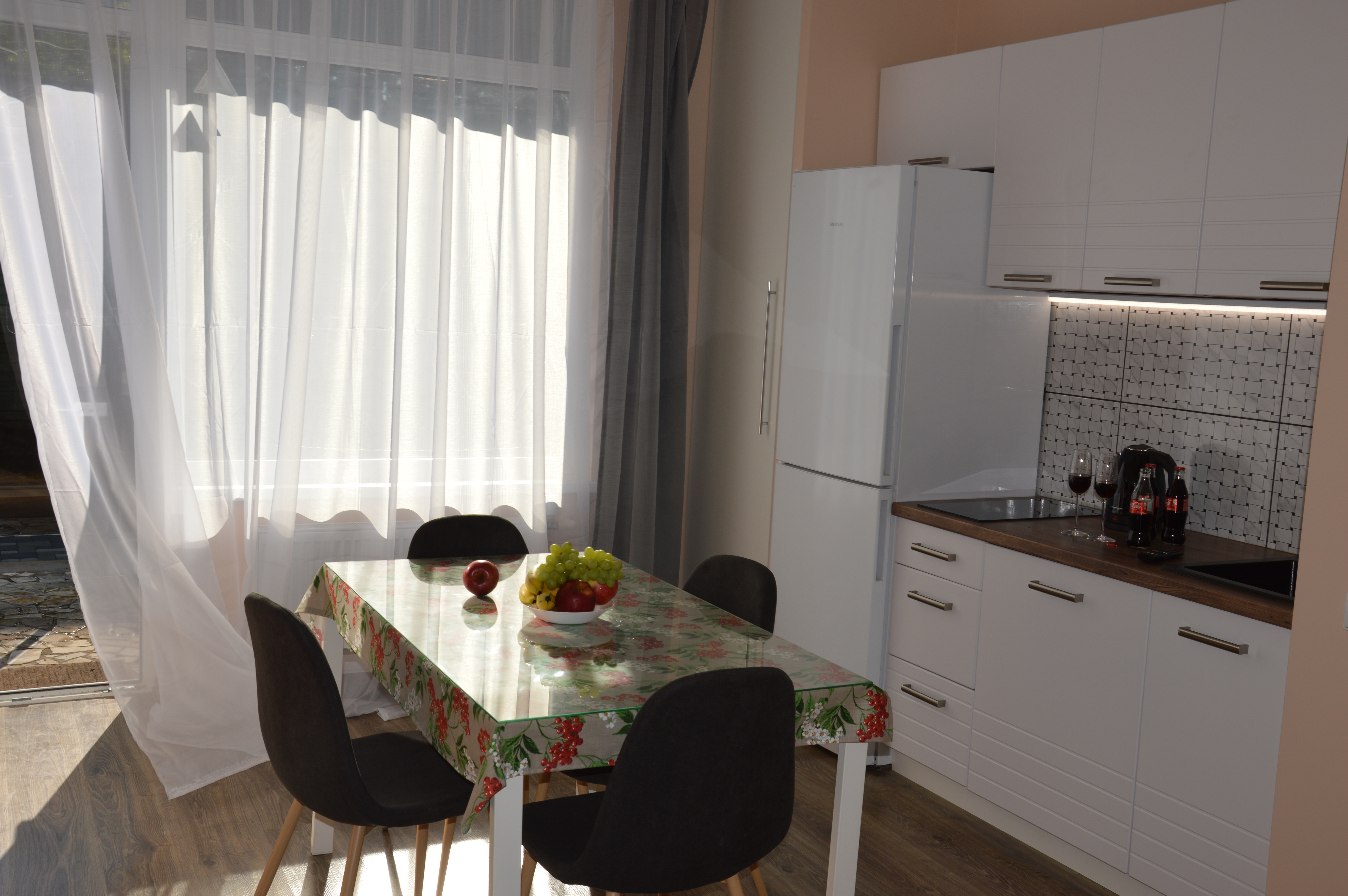 A cozy apartment of 36 m2, where there is a separate bedroom, kitchen, bathroom and children’s beds 90 * 190 cm above the main bedroom. In the kitchen there is a refrigerator, stove, dishwasher, microwave, toaster, kettle, dining area for 4 people with TV. In the bathroom there is a washing machine. In the bedroom there is a bed 140 * 200 cm, a projector for watching YouTube, but you can connect your laptop and watch whatever you want. From the bedroom there is an exit to the backyard, where there is a cocoon swing. On the main terrace at the entrance there is a garden sofa with armchairs and a table. Nearby there is a forest, which makes your holiday quiet and calm, despite the fact that the main street with shops and restaurants is only 700 m from the house, and the sea is 100 m from the house. A separate numbered parking space will solve the frequent problem in the summer of finding a parking space.