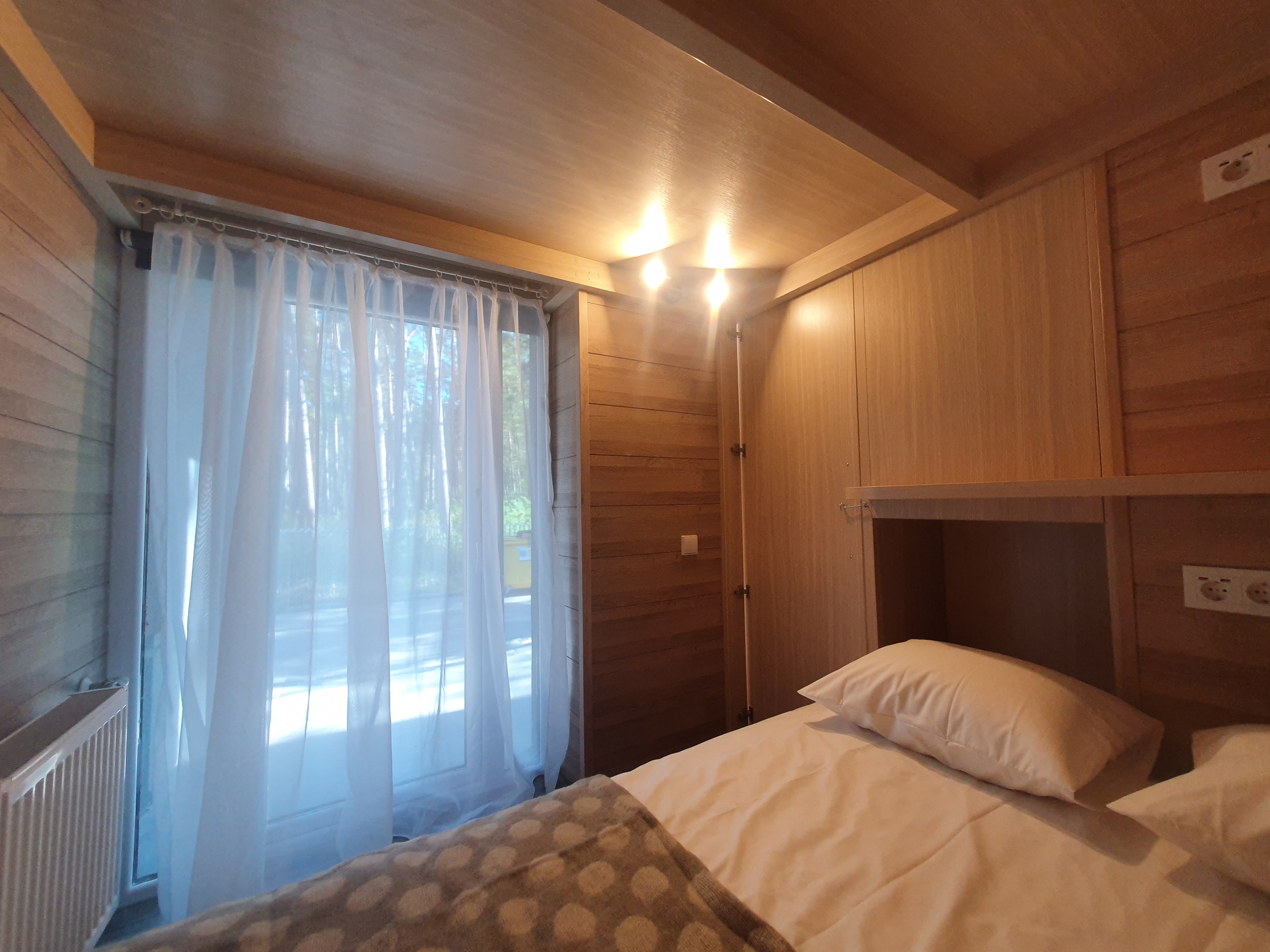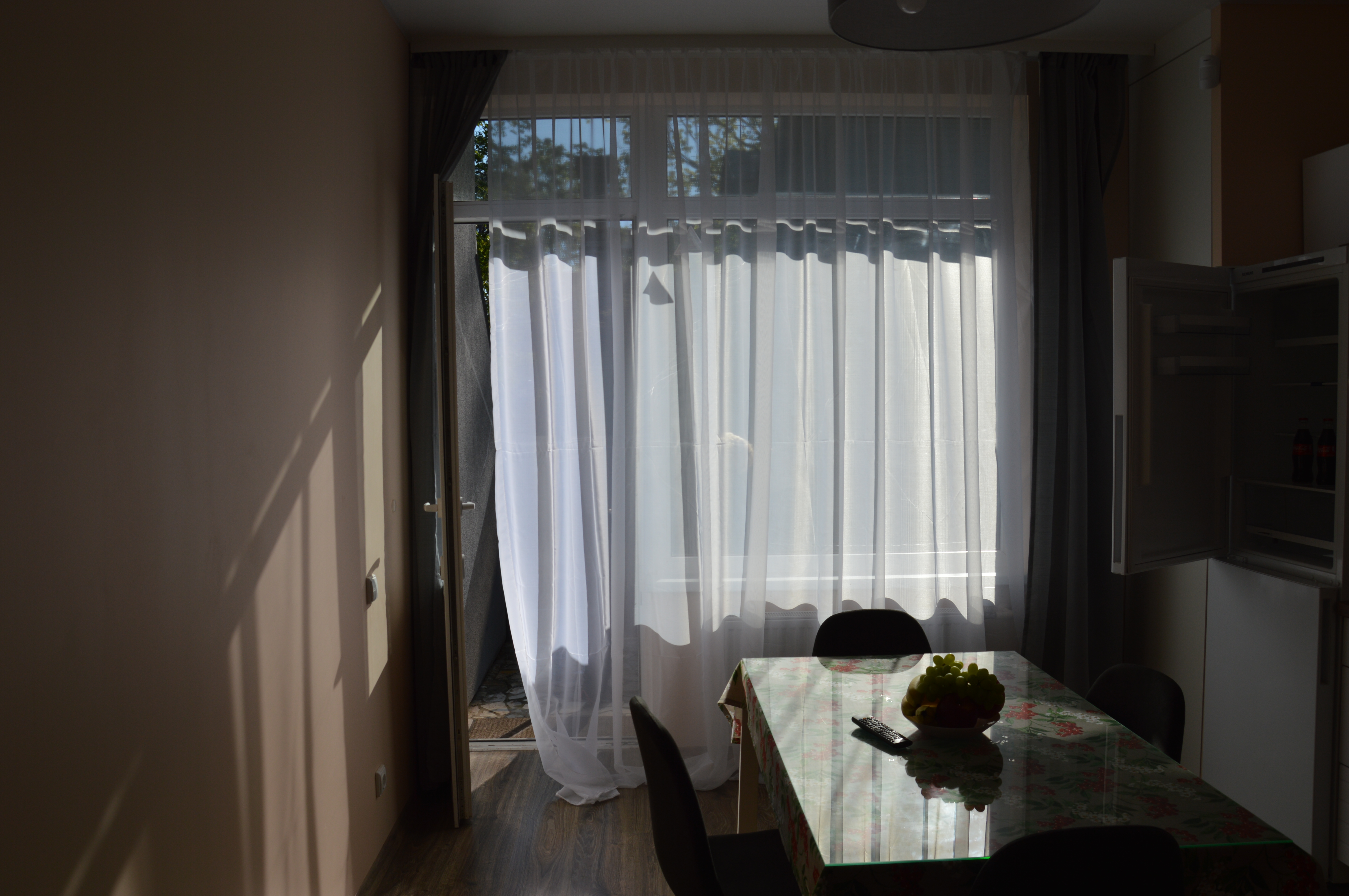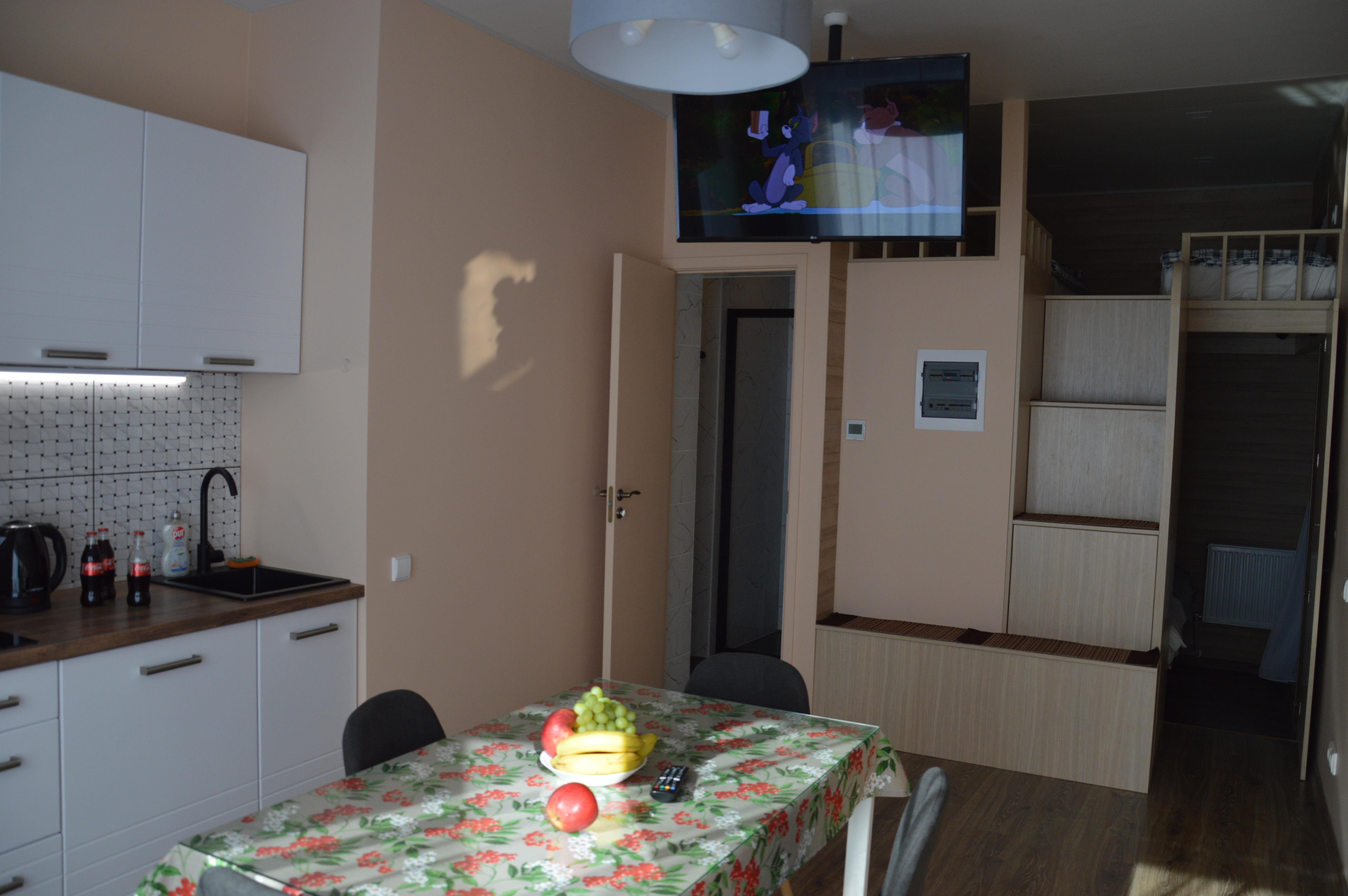 A cozy apartment of 36 m2, where there is a separate bedroom, kitchen, bathroom and children’s beds 90 * 190 cm above the main bedroom. In the kitchen there is a refrigerator, stove, dishwasher, microwave, toaster, kettle, dining area for 4 people with TV. In the bathroom there is a washing machine. In the bedroom there is a bed 140 * 200 cm, a projector for watching YouTube, but you can connect your laptop and watch whatever you want. From the bedroom there is an exit to the backyard, where there is a cocoon swing. On the main terrace at the entrance there is a garden sofa with armchairs and a table. Nearby there is a forest, which makes your holiday quiet and calm, despite the fact that the main street with shops and restaurants is only 700 m from the house, and the sea is 100 m from the house. A separate numbered parking space will solve the frequent problem in the summer of finding a parking space.