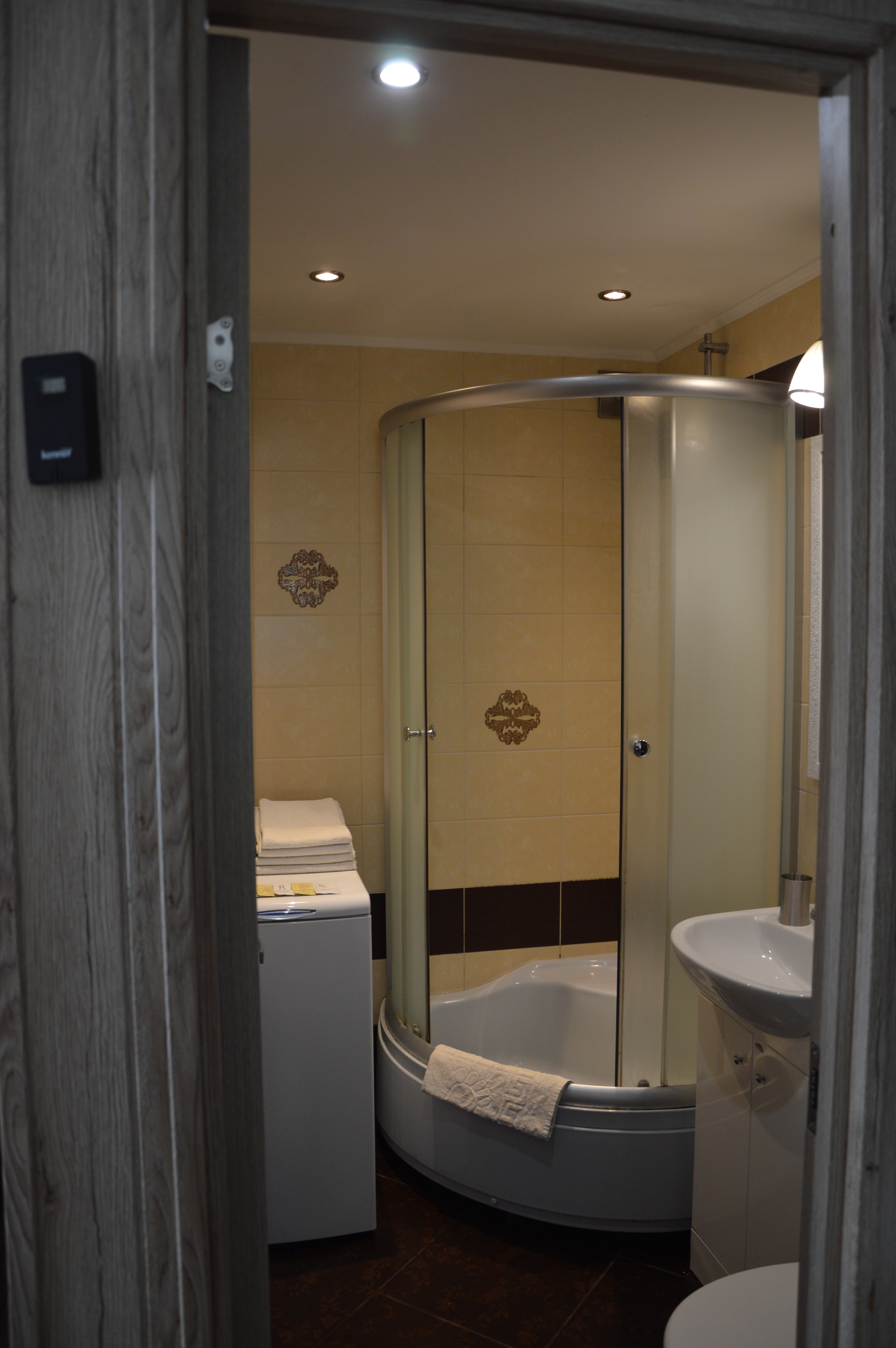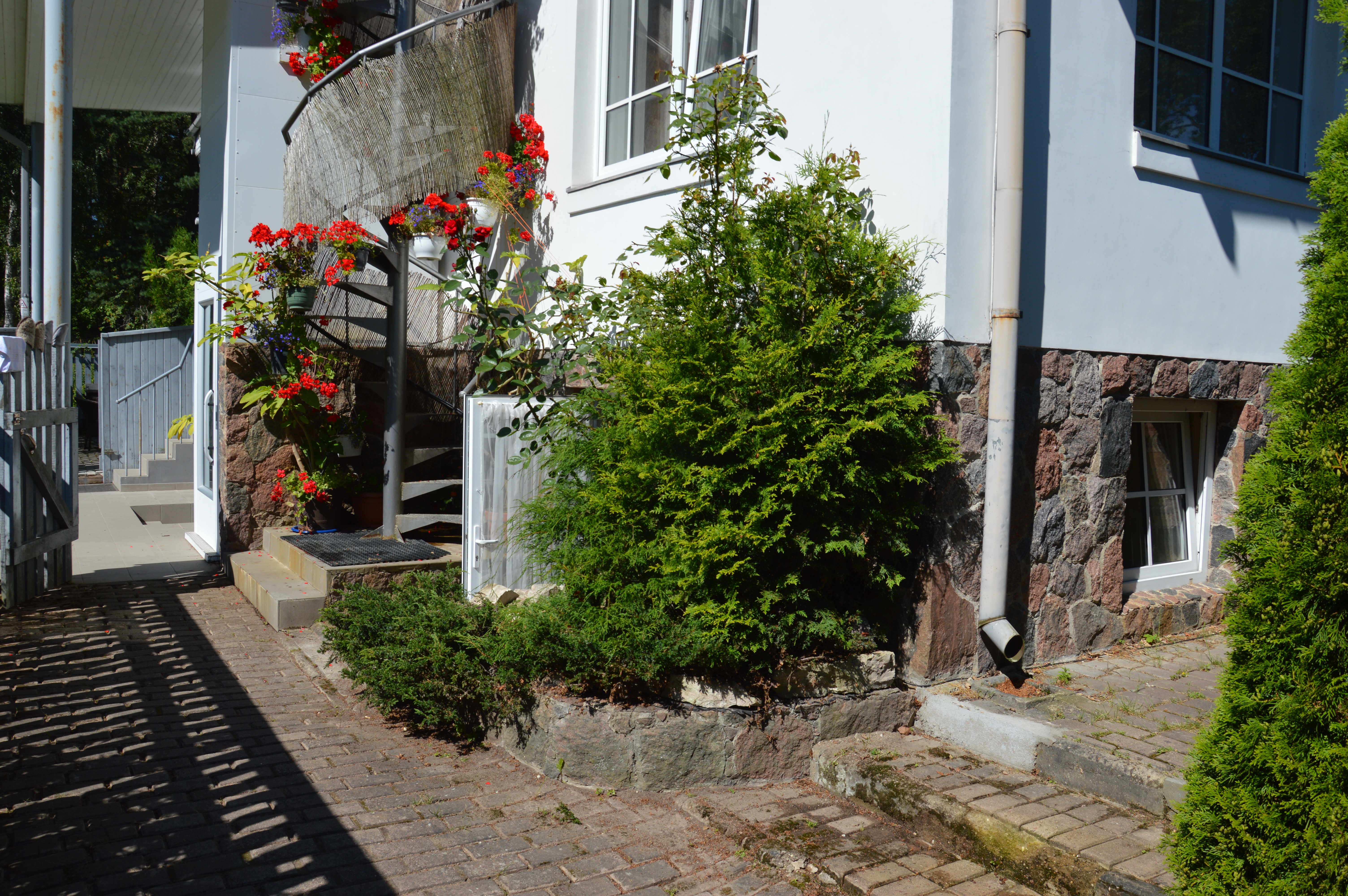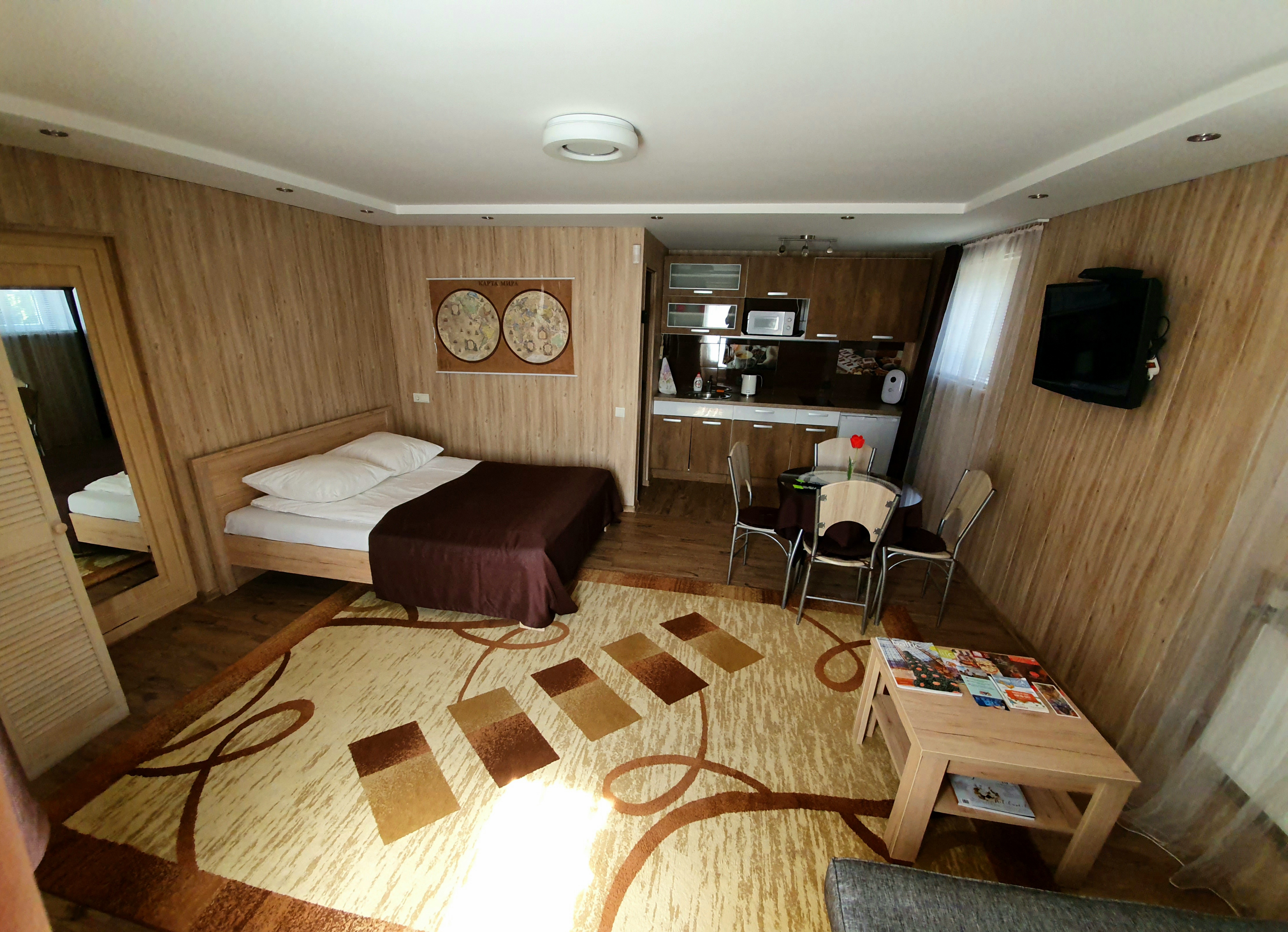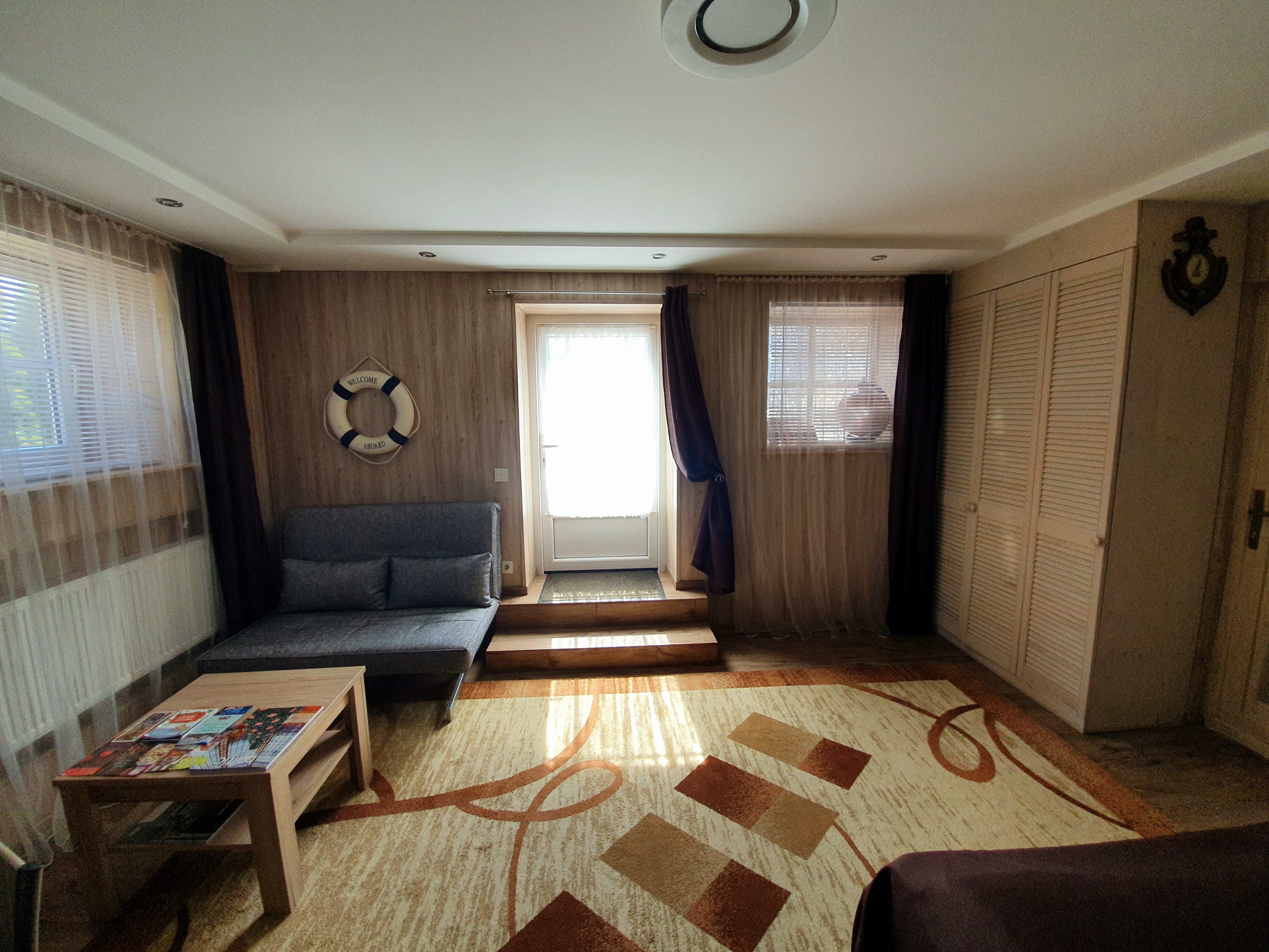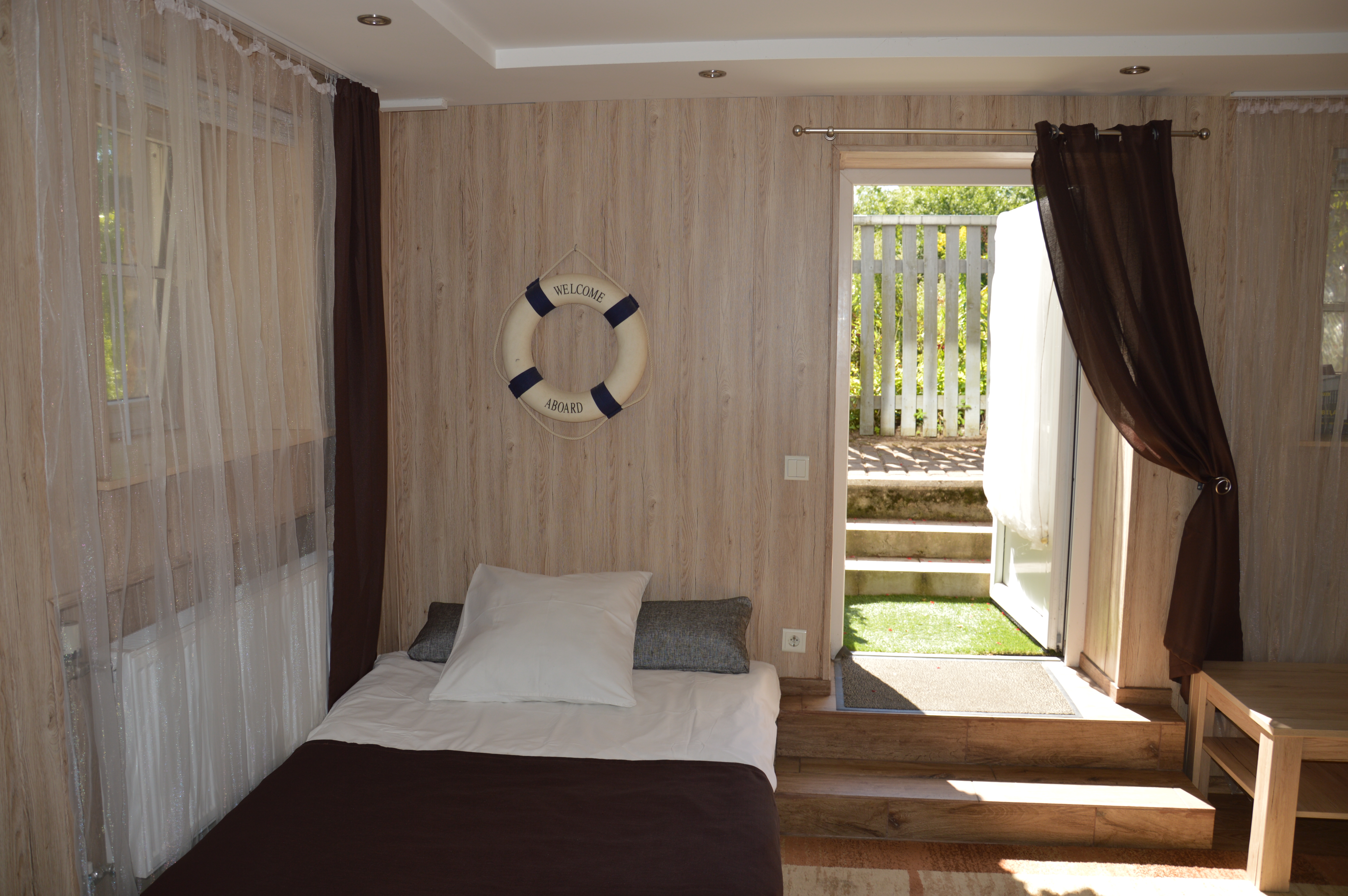 Apartment of 30 m2 with a bathroom, kitchen and double bed measuring 160*200 cm. In the kitchen there is an induction cooker, refrigerator, microwave, dishwasher, dishes. In the bathroom there is a washing machine. Near the windows of the apartment there are garden benches where you can relax or grill. The apartment is located on the low ground floor, so there are a couple of steps down at the entrance.